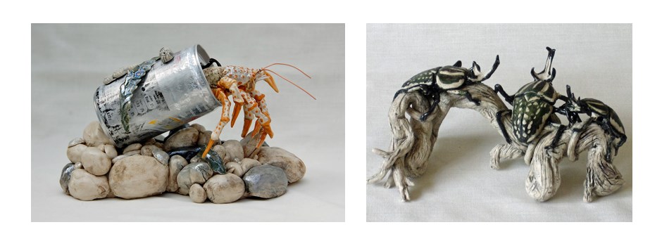 The usually life-sized ceramic sculptures, each individually modelled and intricately detailed, are made of high-fired stoneware or porcelain clay, fired in an electric kiln and enhanced by further firings to fix the various glazes, enamels and metallic lustres. Sometimes, more complicated structures are made in parts and assembled using a variety of media. Jill also works on ideas involving insect subjects, using porcelain and wire.