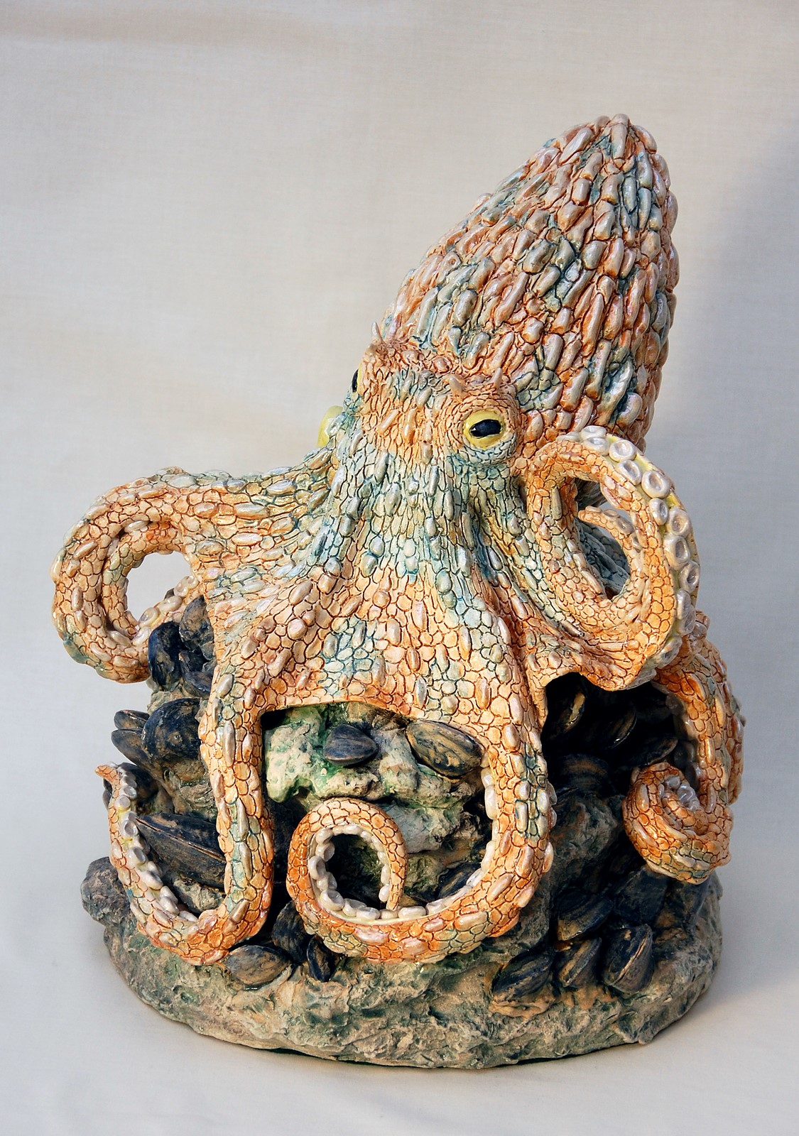 Octopus on rock with mussels - stoneware ceramic - 34x27cms